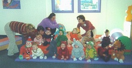 Minnie Mouse hangs out with Mommy and her friends at the party while Daddy works the camera. (Piper is on the left end of the top row.)